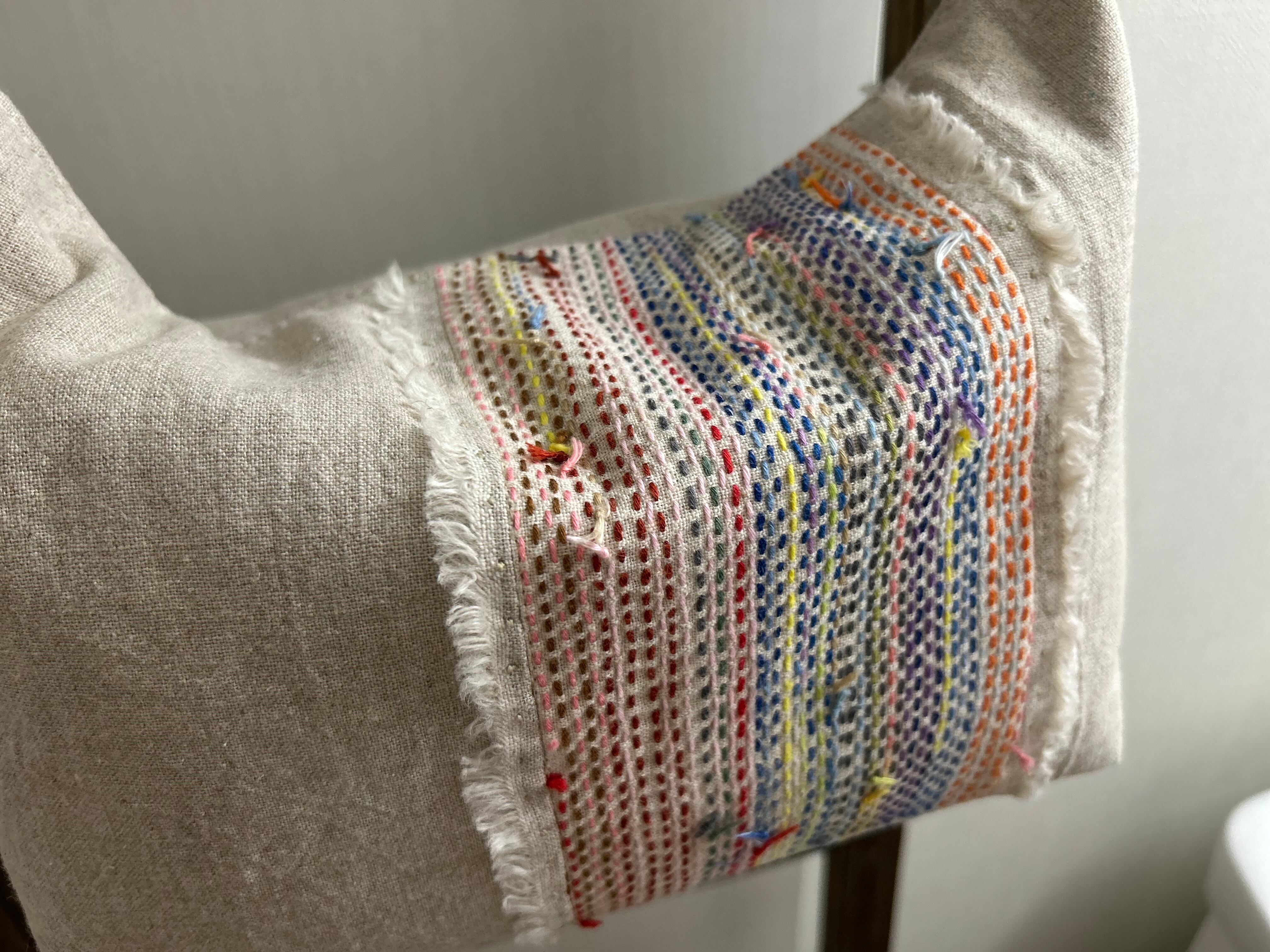 刺し子を続けるなかで、少しずつ余っていった糸たちをなみ縫いでつなぎました。